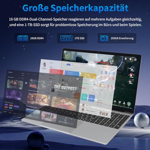 【16GB RAM+1TB SSD+256GB Expansion】Der gaming Laptop ist mit 16GB DDR4 Hochfrequenz-RAM und 1TB Hochkapazitätsspeicher abhängig, der super schnell und reaktionsschnell ist und problemlos Multitasking bewältigt, und kommt mit einem TF-Kartensteckplatz, der auf ein Maximum von 256GB erweitert werden kann, was viel Platz für die Speicherung mehrerer Dateien ist