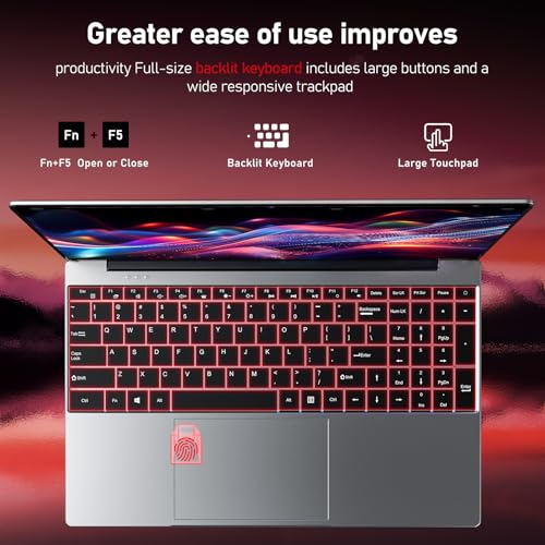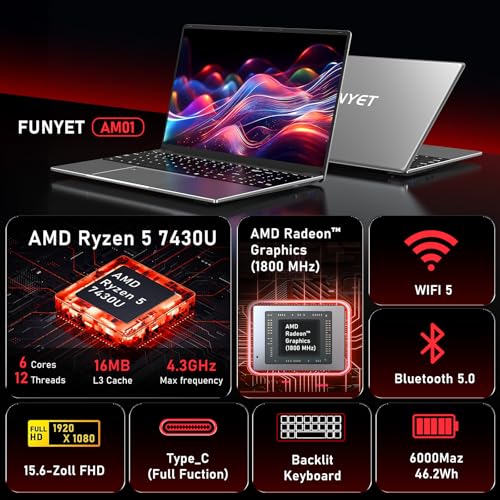 FUNYET Gaming Laptop,15.6-Preis Laptop,Win11 System, R5-7430U Prozessor Notebook,16 RAM+1TB SSD, FHD1920*1080,Fingerprint Unlock, Tastatur mit Hintergrundbeleuchtung,180°Öffnen und Schließen